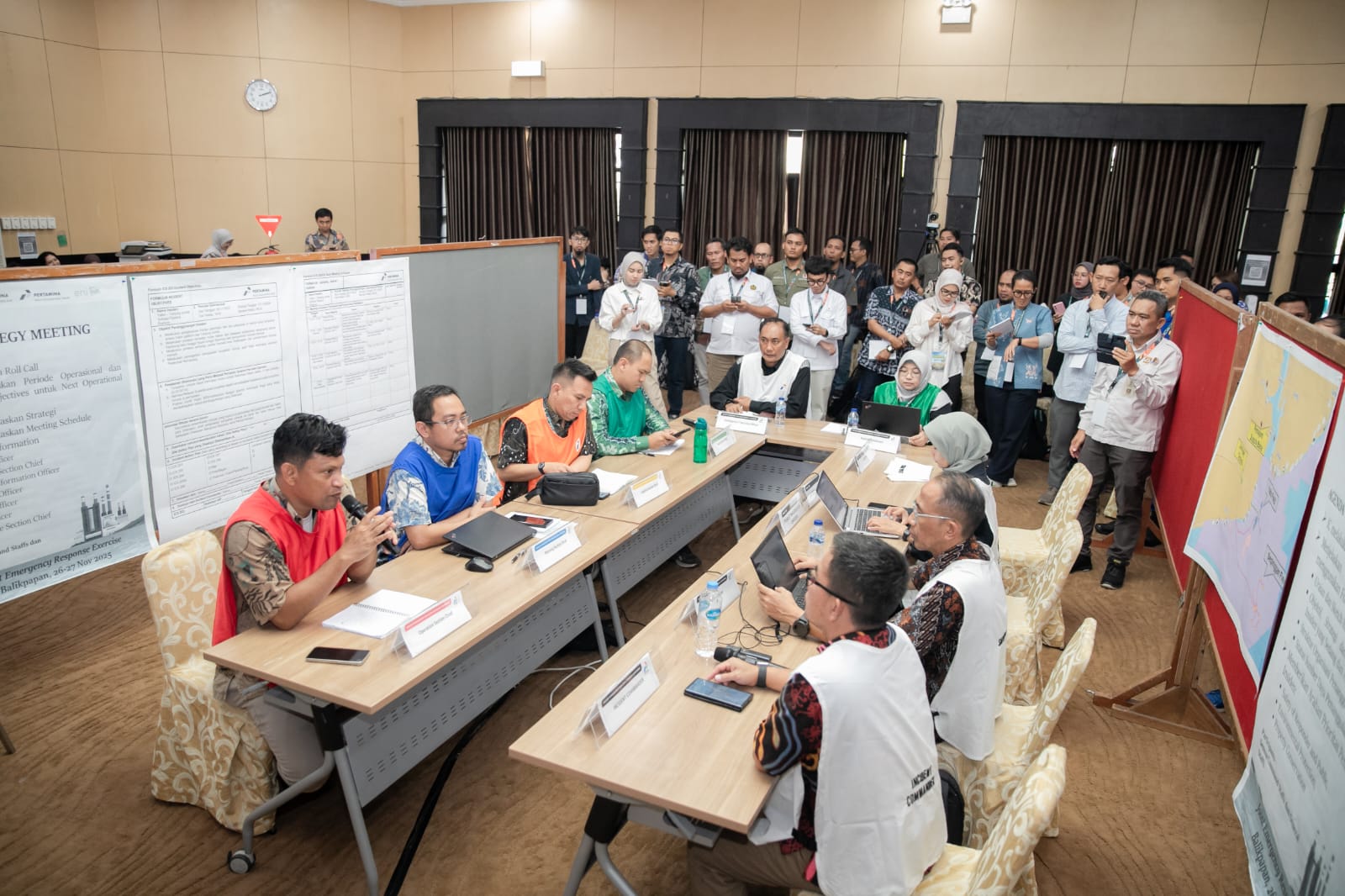 Para peserta mendapatkan rangkaian materi teknis, mulai dari manajemen insiden, struktur komando, komunikasi krisis, hingga praktik kolaborasi antarinstansi dengan pendekatan Incident Command System (ICS). Salah satu sesi utama adalah table-top drill, simulasi yang dirancang mendekati skenario nyata insiden migas. Dalam simulasi itu, Tim Teknis harus membaca dinamika peta eskalasi yang berubah warna mengikuti pergerakan sumber daya, sekaligus mengambil keputusan strategis dalam waktu yang terus berjalan. Di sisi lain, Tim Komunikasi dilatih menghadapi tekanan skenario pemberitaan media dan permintaan informasi dari regulator.