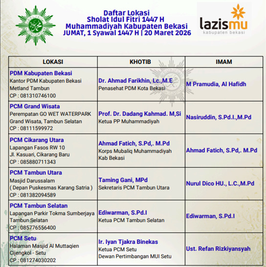Ferryal mengungkapkan Muhammadiyah Kabupaten Bekasi menyediakan 12 lokasi sholat Idul Fitri 1447 H di wilayah Kabupaten Bekasi. “Tidak hanya untuk warga Muhammadiyah tapi untuk seluruh masyarakat umum yang berada di Kabupaten Bekasi yang ingin sholat Idul Fitri pada Jumat 20 Maret 2026” ujarnya.